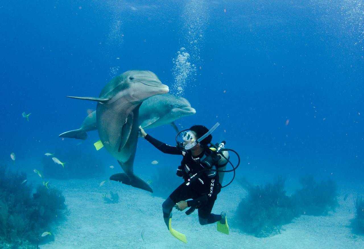 Swimming or diving with a pod of wild dolphins is a truly magical experience, and a far cry from the petting zoo-like encounter staged at captive dolphin parks. In their natural environment, dolphins are curious and playful creatures that often initiate contact with humans, and accept us as fellow aquatic mammals. Divers may have chance encounters with free-swimming dolphins at sites across the Bahamas, but there are certain areas where visits with these gregarious cetaceans are almost guaranteed. These include the waters near Freeport on Grand Bahama Island, and sand flats near Bimini and on the Little Bahama Bank.