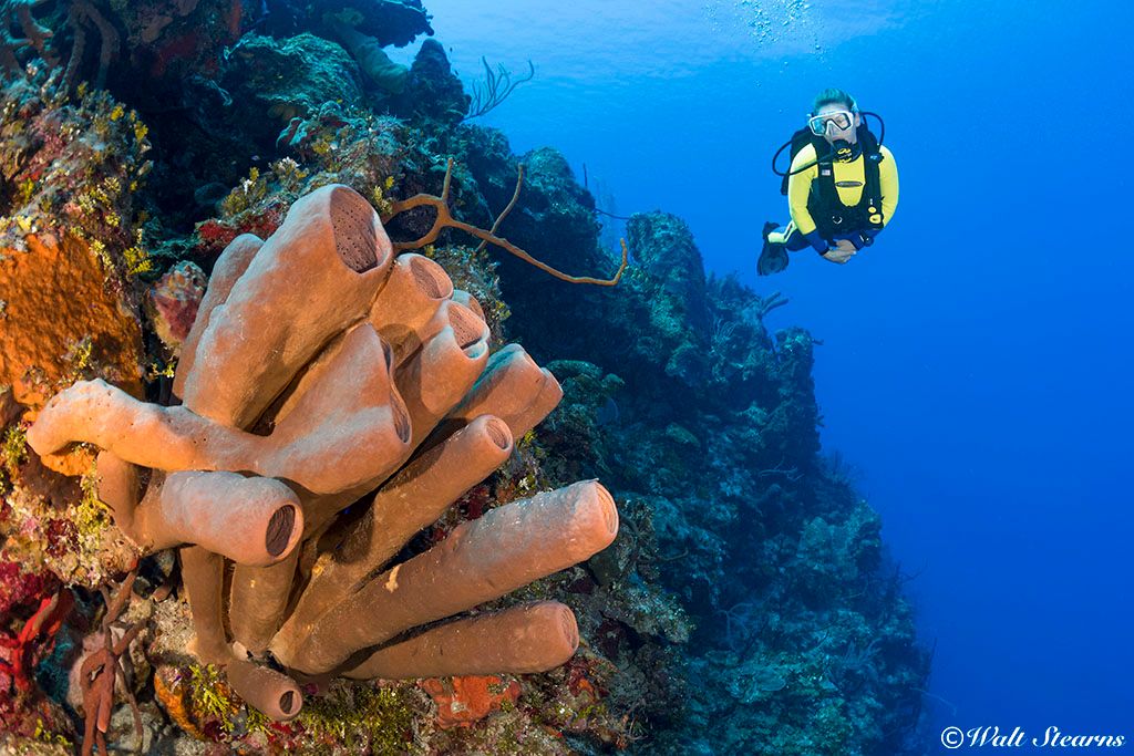 The islands of the Bahamas and the expansive shallows that surround them are actually the tops of huge limestone plateaus that rise abruptly from the depths of the Atlantic Ocean. The edges of these plateaus form steep cliffs that drop to depths of a mile or more. Sunshine and clear waters reveal the full scope of these rampart-like formations. Diving the faces of these underwater walls is a sensation akin to flying, as divers have the unique opportunity to hang weightless, suspended above the void. And because these walls face deep water, there is always the chance that something big will come cruising in from the blue.