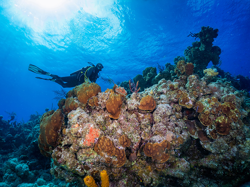 The Bahamas has more coral reefs than the entire Caribbean. Nearly 20,000 square miles of reefs await discovery by divers. Shallow patch reefs create oases of life where divers can devote hours of bottom time to searching for tiny treasures; reef crests adorned with stands of branching elkhorn coral transition to slopes and ledges encrusted with colorful displays of sponges, hard and soft coals, creating ideal conditions for multi-level profiles; grottoes formed by the ebb and flow of currents invite exploration; coral-encrusted pinnacles rise from deep water to attract passing pelagics.