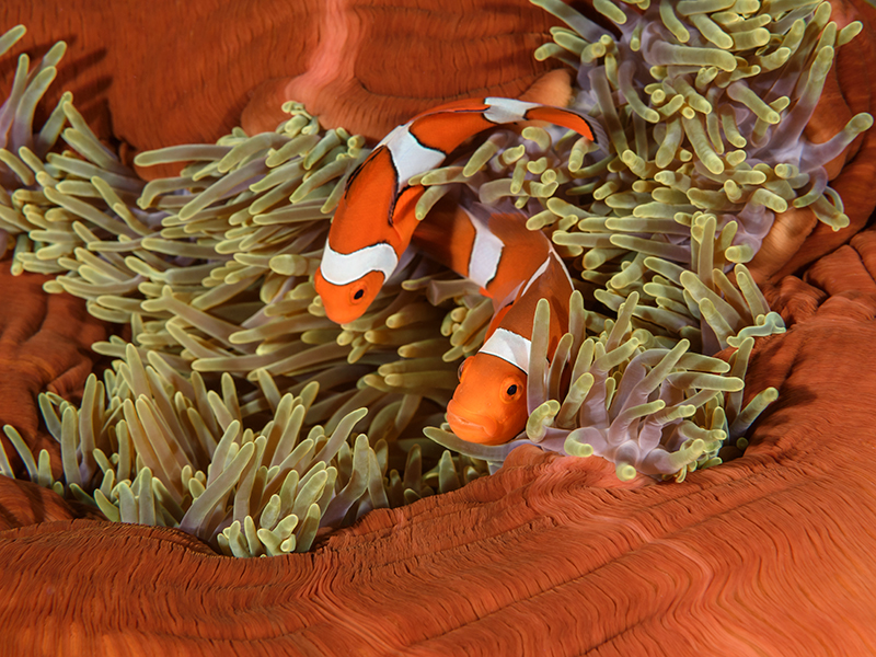 Wrecks aren't the only attraction in the Florida islands. Maravagi Bay offers a wealth of macro subjects including pygmy seahorses, anemone fish, pipefish, and hundreds of varieties of colorful nudibranchs. Ed's and Napoleon's Walls combine dramatic vertical seascapes with huge schools of fish, and the site known as Devil's Highway is an adrenaline-filled drift often shared with manta rays. One site considered a “must do” in this area is Twin Tunnels. Which is a prominent sea mount punctuated by a pair of large lava tubes. A descent into these tunnels leads to a dramatic cave mouth on the edge of a precipitous wall. Like many sites in the Solomons, a dive at this site can end in shallows filled with an abundance of macro life, which creates opportunities for long multi-level profiles.
