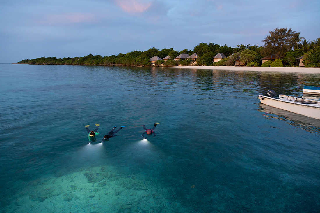 Wakatobi's House Reef has been named the World's Best Shore Dive. It is a mile-wide swath of seagrass meadows and coral shallows that leads to a dramatic slope on the edge of deep water. Divers and snorkelers have been known to devote entire weeks exploring this habitat, and many continue their discoveries into the night. Dives can begin on the beach, but many prefer to enter a stairway on the resort pier. Here, lights from the resort's Jetty Bar attract small marine life, which in turn lure stealthy predators. Closer examination of sea fans may reveal tiny finds such as pom pom crabs, longnose hawkfish, and rare pygmy seahorses. Swimming beyond the jetty reveals a scene bustling with nocturnal activity. Moray eels slither through shadowed crevices. Crabs scuttle across the seabed. Crocodile fish and other cryptic predators lie in wait for unwary passersby. Cuttlefish stage elaborate light shows, using their color-changing talents to create pulsating displays that are thought to mesmerize potential prey. And because all of this takes place at depths of less than 30 feet, divers have plenty of time to enjoy the show.