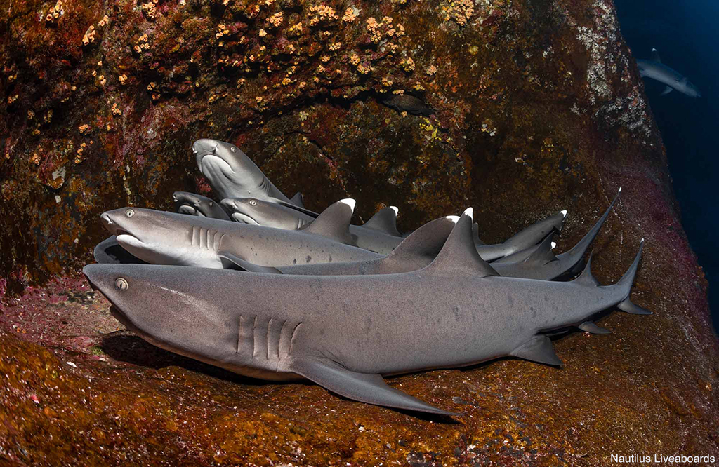 Rising from deep Pacific Waters some 350 miles west of Costa Rica, Cocos Island became the inspiration for the Jurassic Park films. There are no toothy prehistoric reptiles roaming the pristine and uninhabited landscapes of this UNESCO World Heritage Site, but there are plenty of predators lurking in the surrounding waters. Cocos is famous for large schools of hammerhead sharks. Divers can witness this phenomenon on liveaboard trips, and passengers who postpone post-dinner libations can witness another species of shark on the hunt. White-tip sharks spend their days resting in recesses in the reef. Come sundown, they emerge to begin their nightly hunts, and they often hunt in packs. The signature sight for white-tip action is Manuelita Cove, where hundreds of these mid-sized sharks swarm the reefs. Night diving with white-tips is a standard part of Cocos itineraries for liveaboards such as the Cocos Aggressor and the Undersea Hunter.