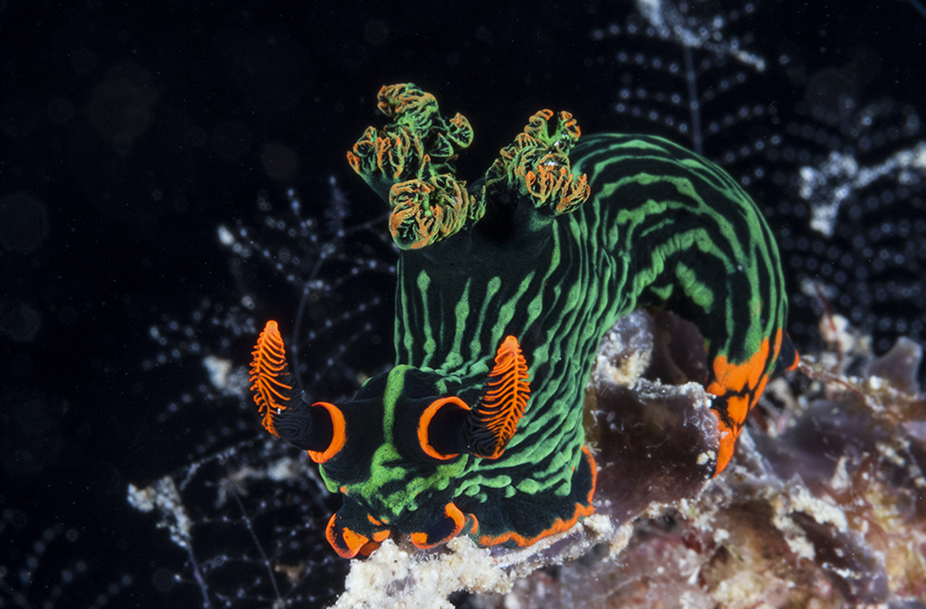 The waters of Lembeh Strait lure macro and muck diving enthusiasts from around the world. They come in search of the more than 1,000 species of rare and critical marine life that thrive in the seabed's black sands. The chances of a trophy find can increase as the sun goes down, making night diving a must-do activity. House reefs provide convenient and easy hunting, while famous sites such as Aer Prang, Teluk Kambahu, and Serena West offer a chance to tally everything from painted and hairy frogfish to ghost pipefish, mimic, wonderpus, and coconut octopi, and rare finds such as rhinopias and Lembeh sea dragons. Dives who love colorful sea slugs can opt for aptly-named Nuid Falls, where a multitude of nudibranchs share soft coral gardens with decorator crabs and delicate harlequin shrimp in a soft coral garden. Resorts such as Solitude Lembeh and Lembeh Resort regularly schedule night dives to these and other sites in the strait.
