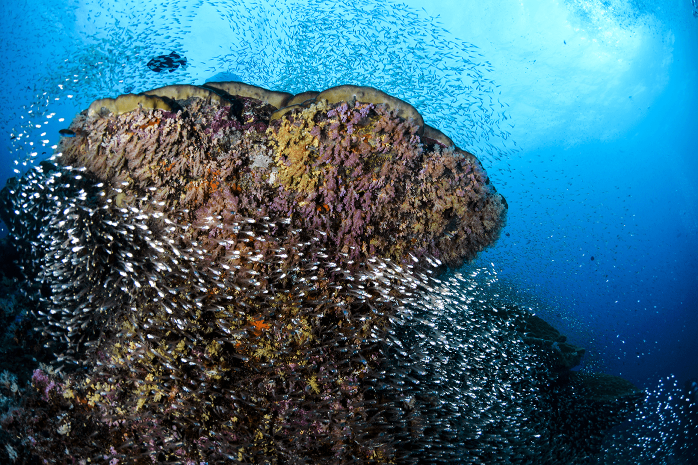 Fish form into groups for a number of reasons. When these gatherings are made up of different species, don't seem to have any organized structure, and aren't moving from place to place, marine biologists would call it an aggregation rather than a school. Sometimes, it's the underwater landscape that causes these aggregations. Thinking in human terms, it would be like having a single picnic shelter in the middle of a park. That's where people will likely congregate—and a rain shower will most certainly drive them together for shelter. In the marine world, an object such as the hull of a ship, a seamount, a protruding coral formation or even a floating log will act as a fish aggregator, providing a safe place where fish can get out of the current or away from predators.