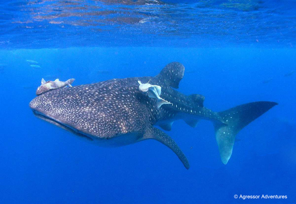 What's there to see? For starters, there are sharks. In all, there are more than 30 species of sharks that have been encountered in the Galapagos. Among the more common are the Galapagos sharks that show up by the dozen. Silky sharks cruising solo or patrol with a pack, while white tips and black tips forage among the rocky slopes. Tiger sharks visit during the warmer months, and massive schools of hammerheads make seasonal appearances. And then there's the biggest shark of all. The Galapagos are known for sightings of large whale sharks, which can reach lengths of 45 feet in these waters. Of course, sharks aren't the only draw at Darwin and Wolf. The waters are filled with swirling masses of bigeye jacks and schools of skipjack and yellowfin tuna. Bottlenose dolphins come to play, turtles are a given and there a good chance of seeing eagle and manta rays.