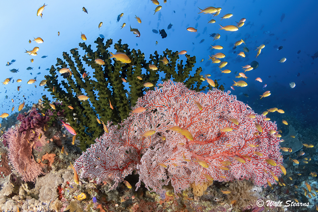 Walls and outcroppings rising from open water attract swirling schools of jacks, rainbow runners, mackerel and tuna, while schooling hammerhead sharks come in from the blue. Turning attention to the lush coral growth will yield smaller treasures such as colorful crinoids and insanely patterned nudibranchs. And then there are the wrecks, one sitting on the edge of the abyss, another that hosts a busy cleaning station where their patronage may include tiger sharks. In all, Tubbataha is home to more than 570 species of fish, 370 species of corals, 11 species of sharks, 12 species of dolphins and whales, plus hawksbill and green sea turtles. A pretty good reward for a boat ride.