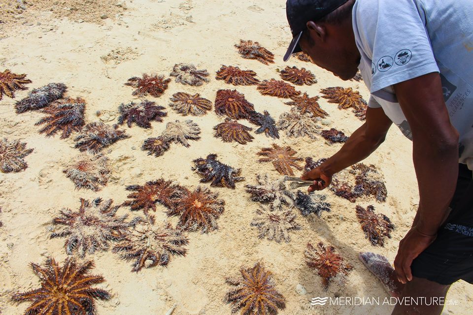 Meridian Adventure Dive Hotel, alongside other dive operators in the area, control and remove COTS where infestations occur - mitigating damage to the coral reefs.