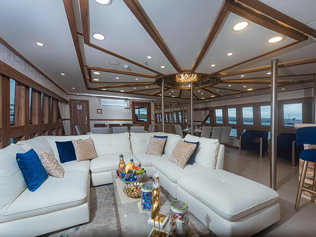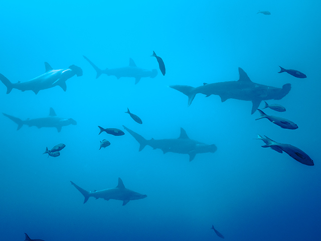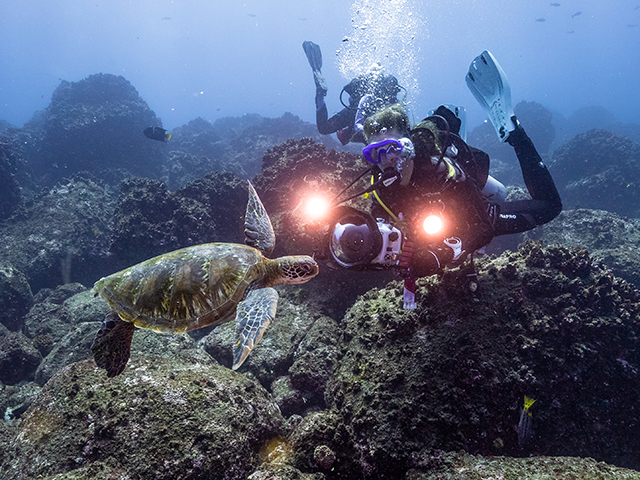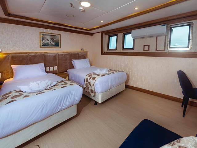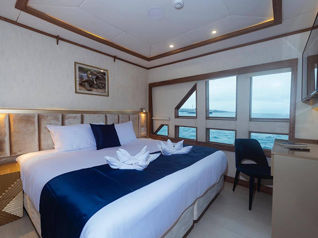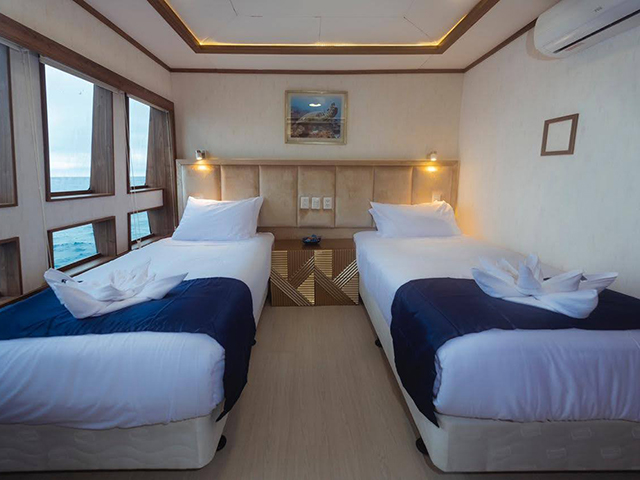 The modern and luxurious Tiburon Explorer specifically designed to cruise the Galapagos Islands visiting its best sites including Wolf & Darwin, Punta Vicente Roca, and Cabo Douglas where divers can spot the endemic marine iguana. Stable, fast, and spacious the vessel accommodates sixteen guests in 9 air-conditioned twin/queen staterooms, all with private bathrooms. Cabins are located on the main and lower decks with windows maximizing views of the Pacific Ocean. Guests will dine on fine cuisine and relax in one of the many lounge areas throughout the vessel. The air-conditioned salon on the main deck offers tables for dining and socializing area. Plus, sunning areas with ample seating and a hot tub are located on the top deck. The well-thought-out dive deck equipped with individual gear bins, camera table, charging station, air and Nitrox filling stations, tank racks and a separate freshwater rinse tank for underwater camera equipment. Diving operations are conducted from two large pangas (tenders), easily boarded from the dive deck with assistance from the dedicated crew.
